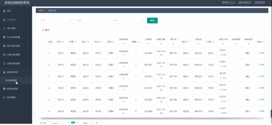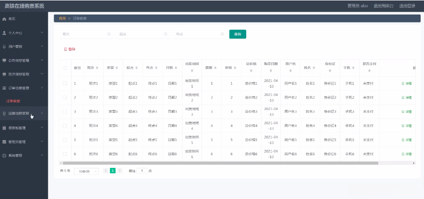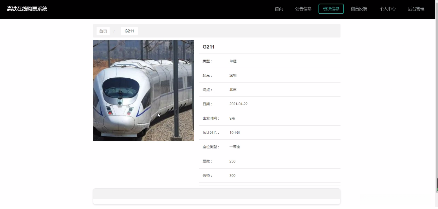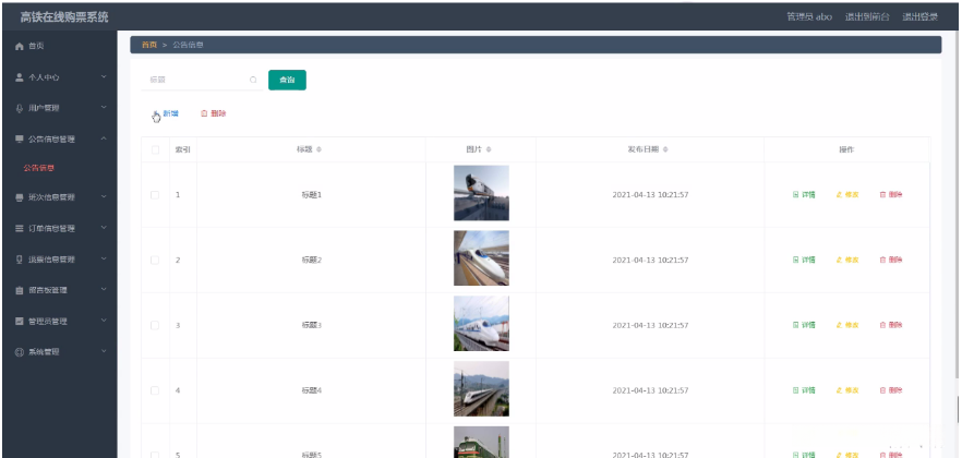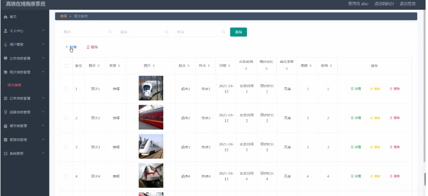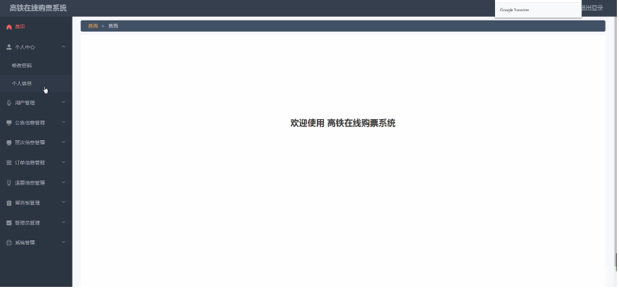 管理员通过使用高铁在线购票系统进行登录后能够浏览首页等信息包括个人中心用户资料以及各类系统功能如图4-7所示