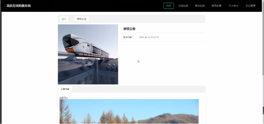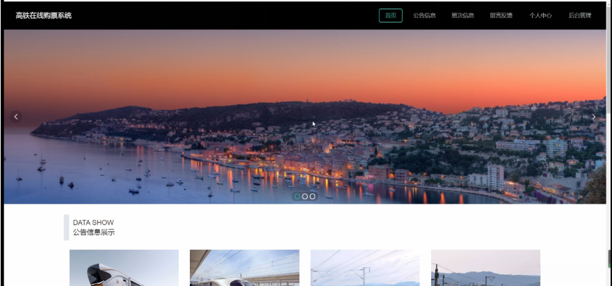 高铁在线购票系统,在系统首页提供全面服务内容,在线用户可以在首页浏览首页信息、查看公告通知、了解列车时刻表以及获取用户评价或反馈意见;同时还可以进入个人账户设置或服务内容,并进行后台管理系统设置或维护内容;具体内容可参考图4-1。
