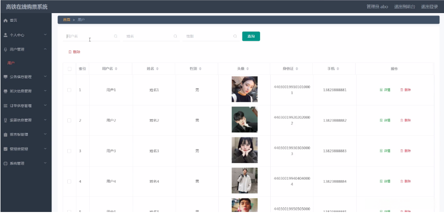 用户管理和相关功能,在用户的管理界面中提供详细的个人信息浏览功能。该功能允许访问用户的索引信息以及用户的个人属性(如用户名)、名字(姓名)、个人属性(性别)、图片标识(头像)、证件号码(身份证)和手机号码(手机)。实现详情或删除的基本操作;如图4-8所示。