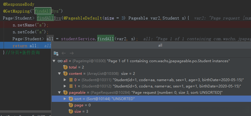 Page<Student> findAllBys(@PageableDefault(size = 3) Pageable var2,Student s){