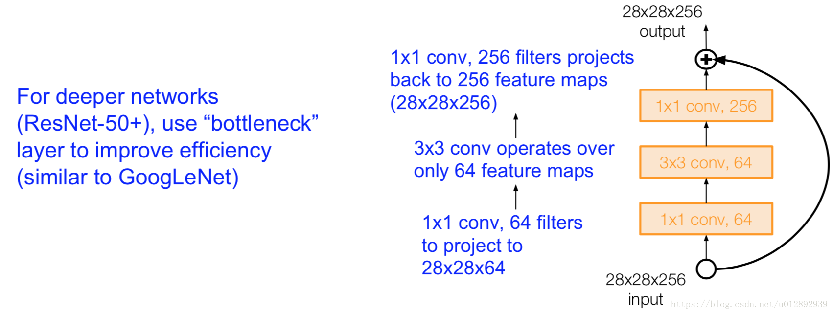 Solution: bottleneck layers which apply 1x1 convolutions to reduce feature depth
