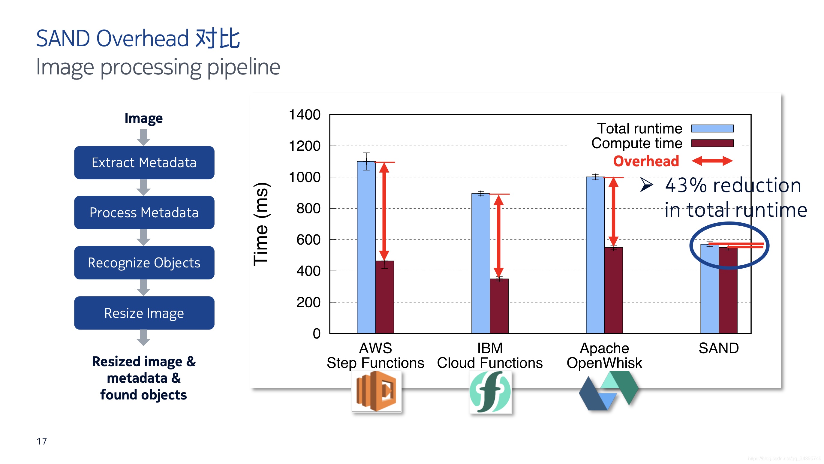 作者提出了一种将该图像处理应用部署方案应用于现有的三大Serverless平台的技术方案。通过对比实测数据发现,在实际承担计算任务的时间仅占约一半左右的情况下就出现了明显的性能瓶颈问题。这种现象的主要源于Serverless平台带来的中间信息传递以及函数启动等额外开销相对较大导致的应用频繁调用性能表现受限这一现象不利于提升系统的吞吐能力并进而影响整体服务效能
