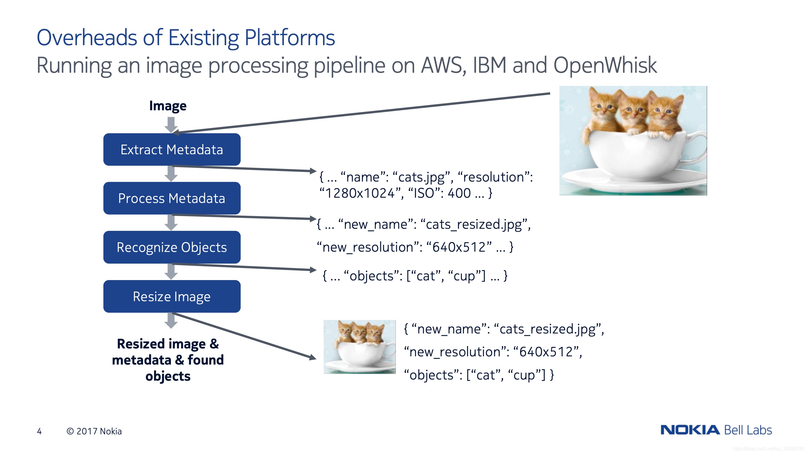 对于开发者来说,在开发应用时就会利用这个Serverless平台来建立很多的应用计算功能。以图像处理应用为例,在这里 开发者创建了四个计算模块 分别用于元数据提取、信息处理、物体识别以及缩放图片尺寸 这些模块之间存在数据传输关系 形成了一个完整的 workflow