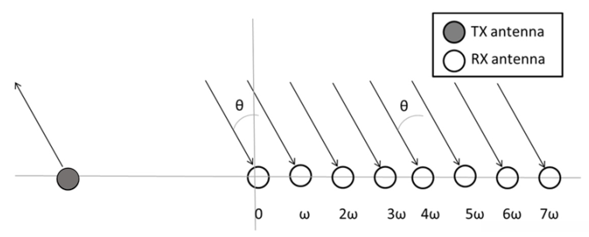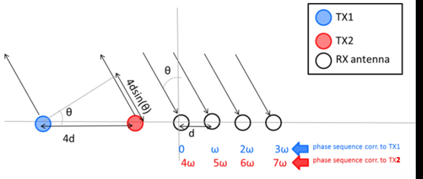 对于2TX4RX雷达,对应TX1的4RX间的相位差为 [ 0,w,2w,3w ],对应TX2的4RX间的相位差为 [ 4w,5w,6w,7w ]。