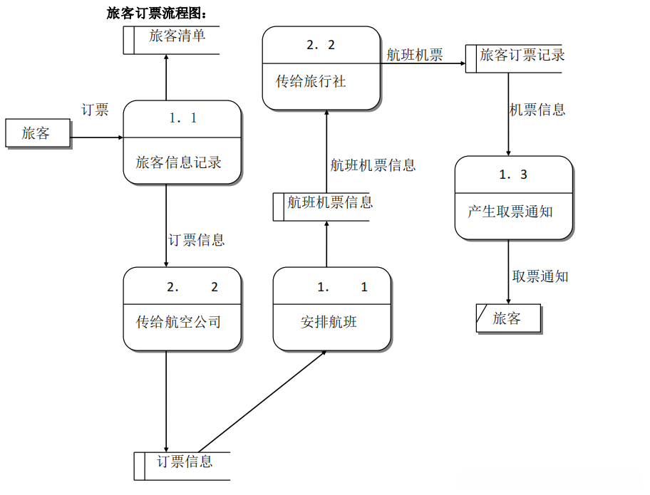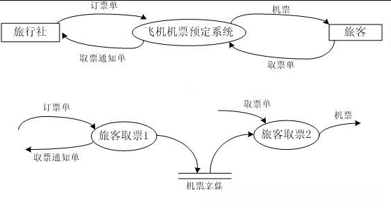 机票预订系统的数据流图包括两部分:旅客订票和旅客取票两部分。具体如