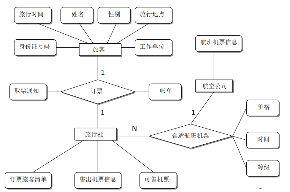 机票预定系统的逻辑模型(实体—关系图)如下图所示: