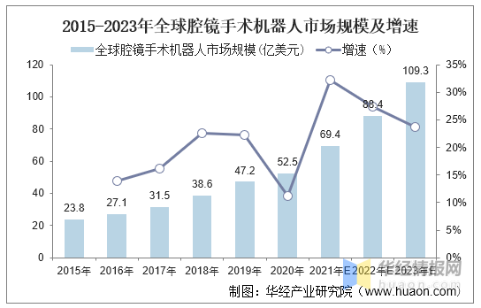 2015-2023年全球腔镜手术机器人市场规模及增速