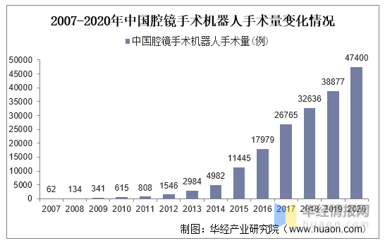 虽然中国引进机器人辅助腔镜手术的时间较美国晚,但在中国日益普及,主要由于微创伤技术日益成为优先选项以及其在治疗早期前列腺癌等疾病方面的独特优势。2007年至2020年期间,中国腔镜手术机器人手术量快速增长,从62例增至47400例,年复合增速为66.65%。