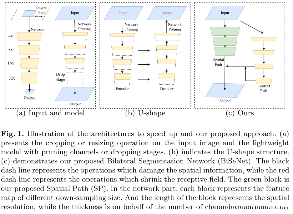 近期论文中有三种方法用以解决图像分割的快速响应需求,首先,限制输入大小,这种方法缺点为会丢失空间细节,尤其是图像边界(裁剪和resize);其次,修剪通道(模型前几层),缺点是弱化了空间容量,减少精度;最后,减少最后几层的数量(遗弃下采样层),缺点是感受野会下降。