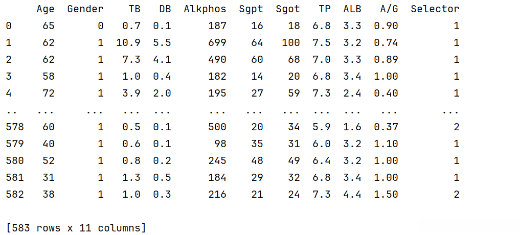 data =pd.read_csv('ILPD(印度肝病患者数据集)数据集.csv', encoding="utf-8")