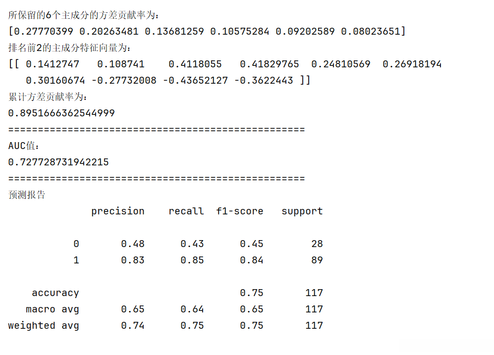 目的:进一步提高模型的准确率和效率。 步骤与方法: 主成分分析(PCA): 降维:通过PCA将数据从高维空间映射到低维空间,保留主要信息的同时减少计算量。 去噪:PCA可以去除数据中的噪声和冗余信息,提高模型的泛化能力。 使用降维后的数据重新训练随机森林模型:利用PCA降维后的数据进行模型训练,观察模型性能是否有所提升。 实验原理总结 本实验通过数据预处理提高数据质量,通过数据探索性分析发现数据中的模式和趋势,进而选择合适的机器学习模型进行预测。在模型选择过程中,通过对比不同模型的性能指标(Recall、Precision、F1值)选择最优模型。为了进一步提高模型性能,采用主成分分析对数据进行降维处理,并重新训练模型。这一过程体现了机器学习在医疗诊断领域的应用潜力和价值。 |