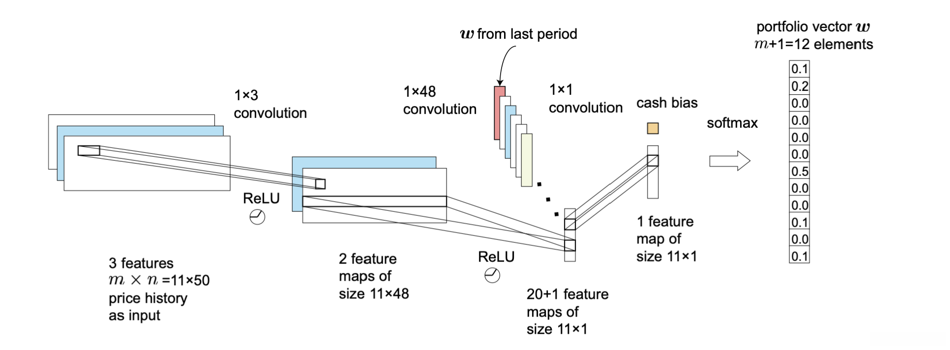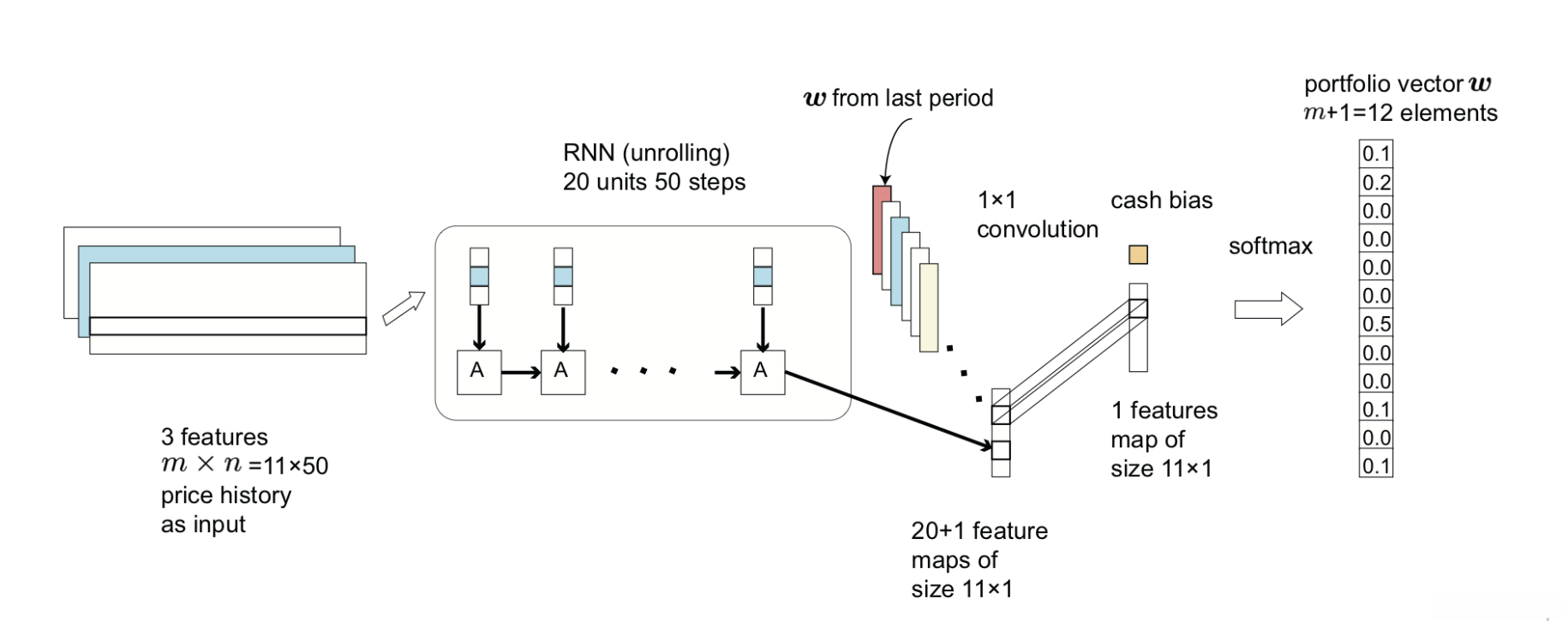 本文开发了一个专为项目组合管理任务设计的强化学习(RL)框架。其核心是基于完全相同的独立评估者集合构成的EIIE拓扑架构。IIE作为一种神经网络模型,在分析历史数据并预测资产潜在增长方面发挥重要作用。每个资产组在其所在组合中的重要性权重变化程度决定了其评估分数,并经由指数衰减后输入至softmax层来确定下一交易期的新组合权重分配方案。除了利用市场历史记录外,在EIIE中还引入了上一期的投资组合权重信息配置项。这要求RL代理人在执行投资决策时需权衡交易成本对整体财富收益的影响效果。因此将各期的投资组合权重记录于投资组合向量存储器(PVM)中成为必要操作步骤。在此基础上,EIIE采用了一种适合事前训练、历史回测以及实时在线学习相结合的在线随机批量学习方案(OSBL)。这种学习方法可同时应用于事前训练、历史回测以及实时在线学习过程中的策略优化机制设计上。为了提高框架的整体性能,EIIE设计了基于周期累计收益的最大化的目标函数表达式,并在此框架指导下,通过梯度上升的方式实现了功能模块的有效优化与协同进化过程研究工作随后分别测试了卷积神经网络(CNN)、基本递归神经网络(RNN)以及长短记忆网络(LSTM)三种不同的IIE架构设计方案
