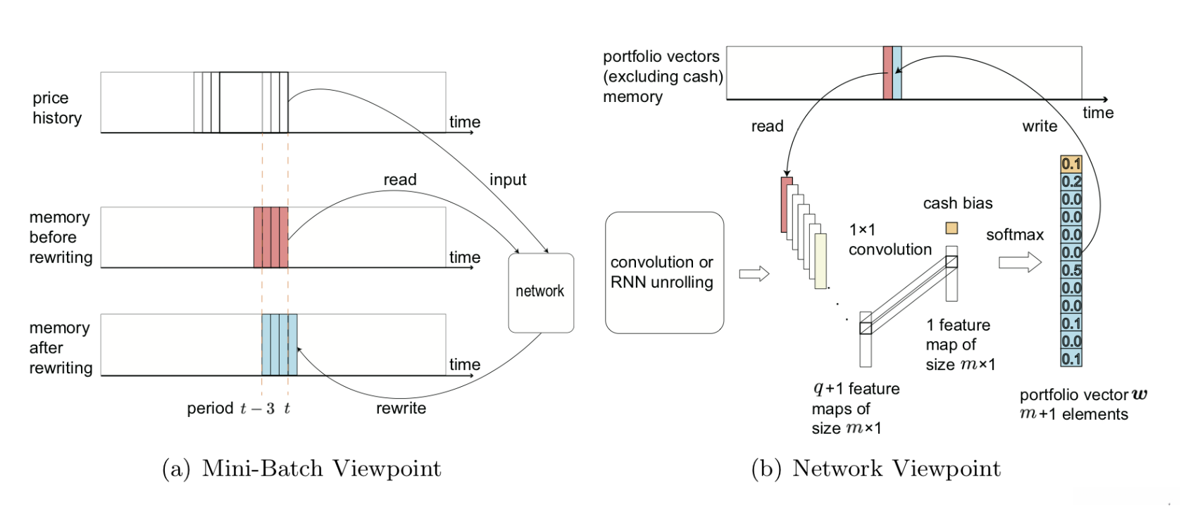 PVM是一个按照时间顺序排列的投资组合集合,在初始化时采用相同权重;在每次训练步骤中,策略网络从当前内存位置加载上一个时期的PVM并将其输出值覆盖当前内存;当policy网络的参数在多个训练阶段趋于稳定时,内存中的数值也随之趋于稳定。