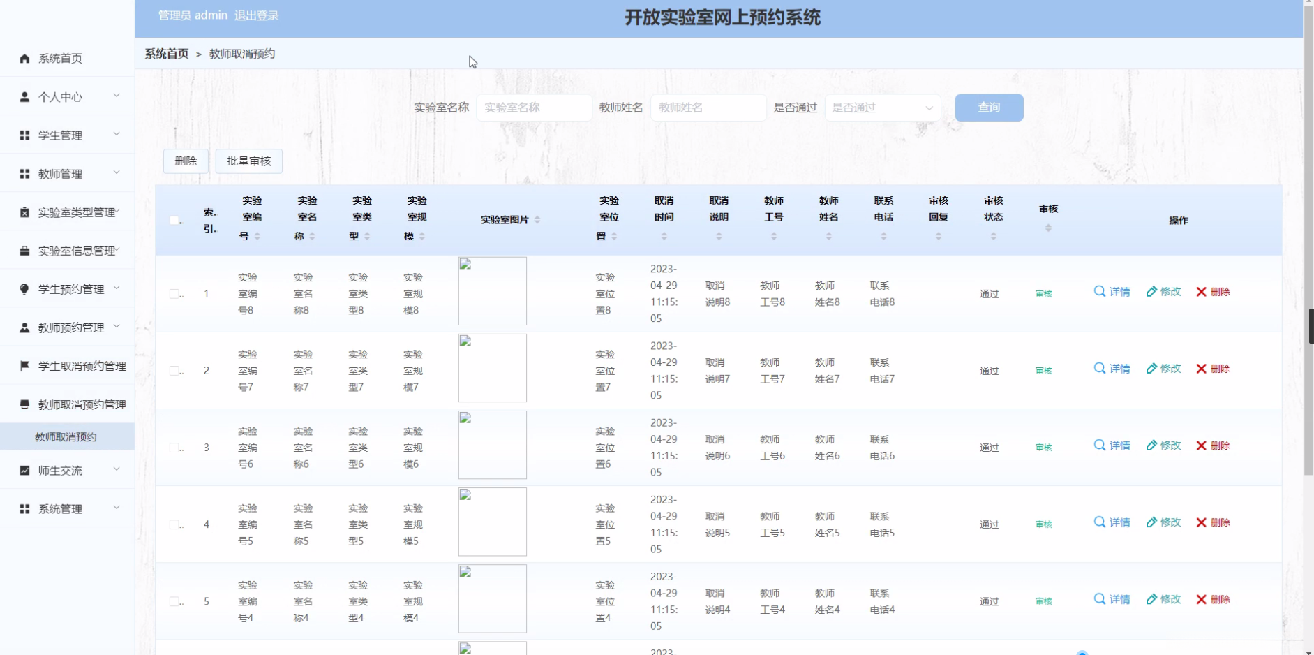 本研究旨在开发一个开放实验室网上预约系统。该系统将包含以下功能模块:第一部分是学生管理模块,支持学生完成注册、登录以及个人资料的管理;第二部分是教师管理模块,具备录入教师个人信息并进行管理的能力;第三部分是实验室信息管理模块,能够实现实验室基本信息的录入、查询、修改及删除;第四部分是学生预约管理模块,实现学生对实验资源预约申请及后续操作流程;第五部分是教师预约管理模块,支持教师对实验资源进行预约申请及相应审批环节;第六部分是实验室类型管理模块,其主要功能是实现实验室类型的信息分类与维护;第七部分为学生取消预约功能,允许学生解除已预约实验资源的相关操作;第八部分为教师取消预约功能,提供教师解除已授权实验资源使用资格的方式。通过整合以上各功能模块,最终构建出一个操作简便且功能完善的开放实验室在线预约管理系统。
