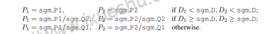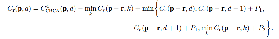 超参数sgm P1和sgmP2为差距图中的不连续性设定了一定的惩罚权重。当D1或D2中的一个表现出较强的图像梯度时,则基础惩罚将减半;若两者均表现强梯度,则基础惩罚将减至原来的四分之一。在考虑两个垂直方向的情况下,在垂直方向上的P值会进一步降低一倍。在地面对比数据中,在垂直方向上观察到的微小变化比水平方向更为频繁出现,并因此应受到较轻的惩罚。CSGM(p,d)的成本计算采用四个方向取平均的方法。
