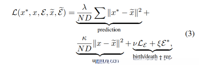 对于跟踪目标的出现和消失问题,作者使用可变长的向量\varepsilon\in(0,1)^N,该N维向量表示每个target在当前帧存在的可能性。通过使用交叉熵损失来计算这部分与ground truth的loss。