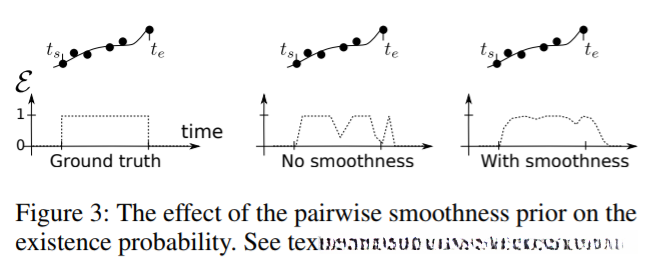 在跟踪过程中物体会由于遮挡使得在当前帧的存在的可能性降低,这会导致一旦物体发生遮挡模型就认为该物体消失了该物体的跟踪路径也将随之结束,所以作者希望能够让可能性随时间的变化尽量平滑。作者通过最小化两帧的\varepsilon的差值的绝对值来达到平滑的效果。