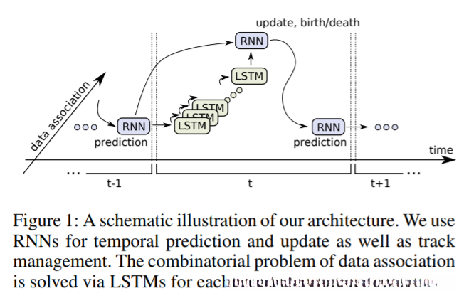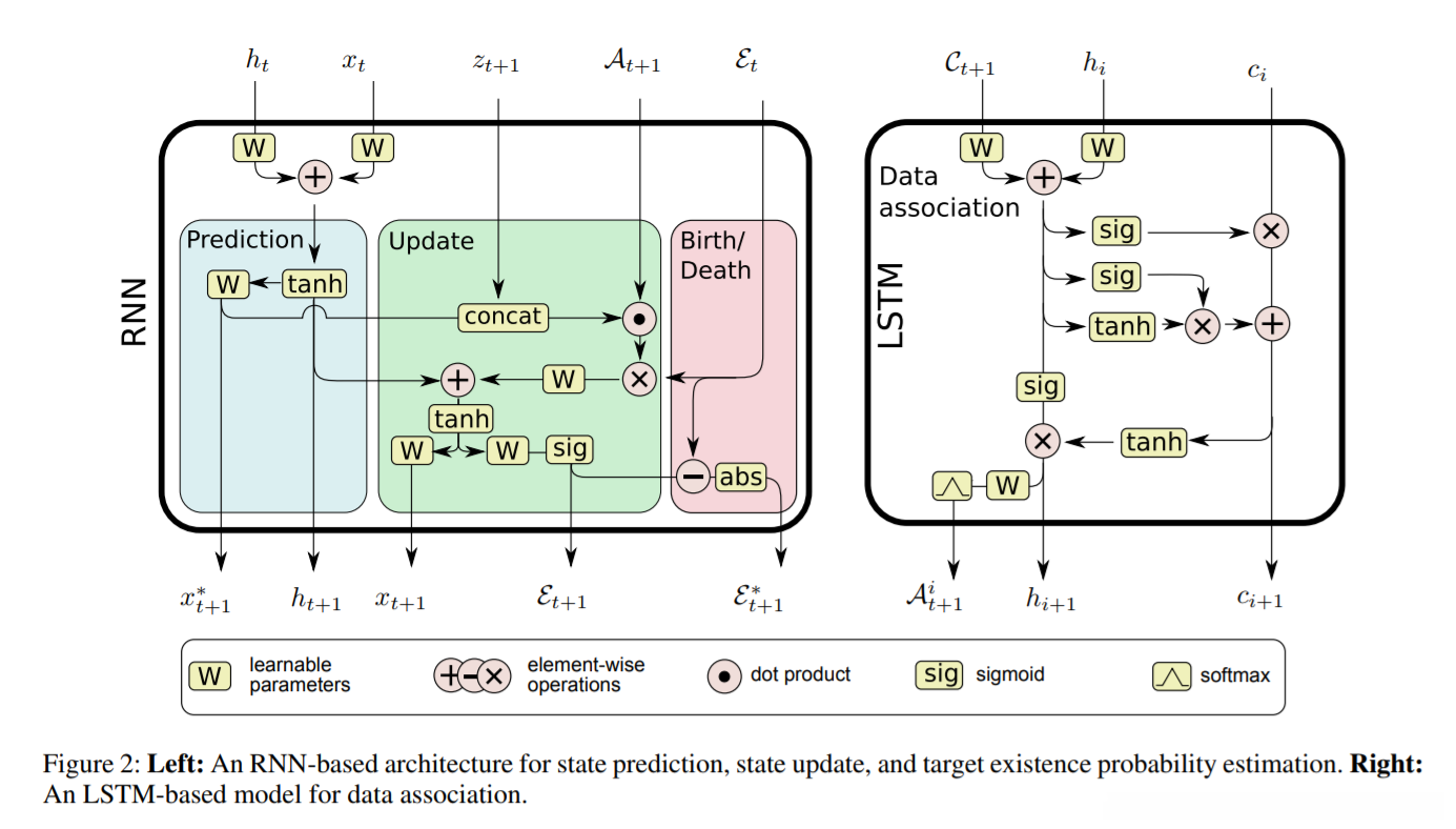 跟踪状态更新问题 作者使用LSTM网络作为预测物体运动的网络,LSTM可以选择性的保留之前的状态信息,作者利用这一特性实现了物体消失和物体出现的状态更新操作。