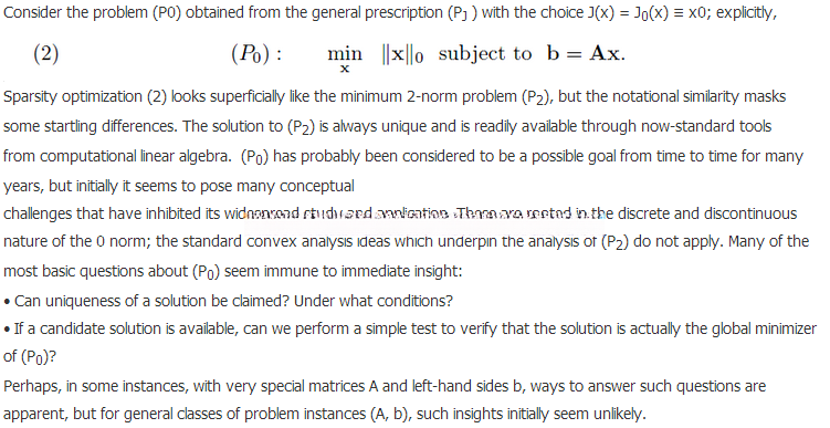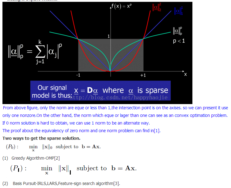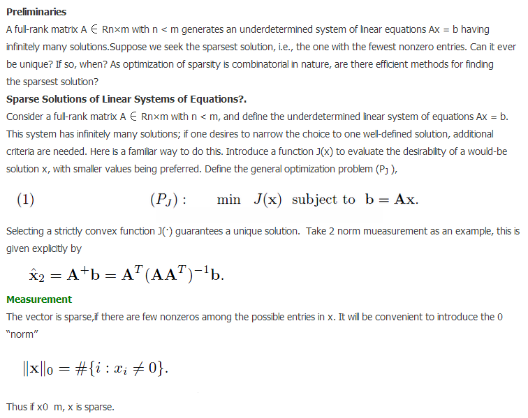 听起来似乎也不太容易理解呢。也就是将一个0范数的问题转化为一个1范数的问题吧。因为0范数实际上代表的是向量中非零分量的数量嘛!不过这可是属于NP难问题哦!无法找到精确解的话就可以考虑将其转化为一个带有凸性的优化问题——也就是所谓的1范数优化模型了。而1范数指的是各个元素绝对值之和嘛!由于数据的稀疏性,在这种情况下我们希望绝对值总和尽可能小对吧?以后我们会详细讨论这个算法哦!下面引用一下甄亮利老师的一篇博客内容作为参考材料吧!