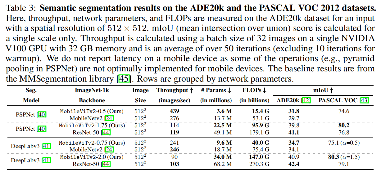 我们将 MobileViTv2 与两个标准的分割架构 PSPNet [40] 和 DeepLabv3 [41] 集成,并在两个标准的语义分割数据集上对其进行研究,ADE20k [42] 和 Pascal VOC 2012 [43]。有关训练细节(包括超参数),请参见补充材料 。