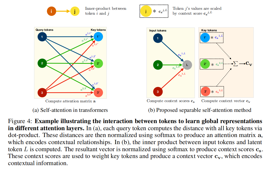 我们分离自注意力方法的主要思想如图 4 (b) 所示 ,即根据潜在标记 L 计算上下文分数。然后使用这些分数对输入标记进行加权以产生一个表示全局信息的上下文向量。由于所使用的自注意计算是基于潜在标记的,因此本方法可以将变压器中的自注意复杂性降低 k 倍。本方法的一个简单而有效的特性是它使用标量运算(例如求和和乘法)来实现,使其成为资源受限设备上的一个好的选择。我们称这种注意方法为分离自注意,因为它允许我们通过两个独立的线性计算替换二次 MHA 来编码全局信息。改进后的模型,MobileViTv2,是在MobileViT中用分离自注意力代替MHA得到的。