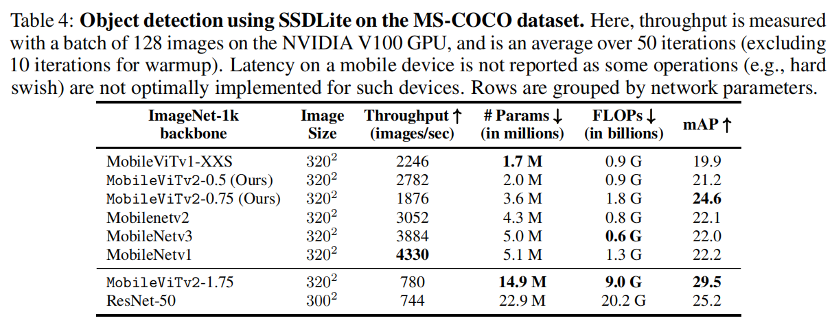 我们将 MobileViTv2 和 SSDLite [24][46] (具有分离卷积的 SSD 头) 集成为移动目标检测,并在 MS COCO 数据集上[47] 对其性能进行研究。我们在训练检测模型时遵循了[4] 的方法。表 4 和图 2b 比较了使用不同的 ImageNet-1k 框架的不同验证平均精度(mAP)的 SSDLite 检测性能 。MobileViTv2 在不同容量的模型中表现出竞争性的性能,进一步证明了所提出的方法的有效性。