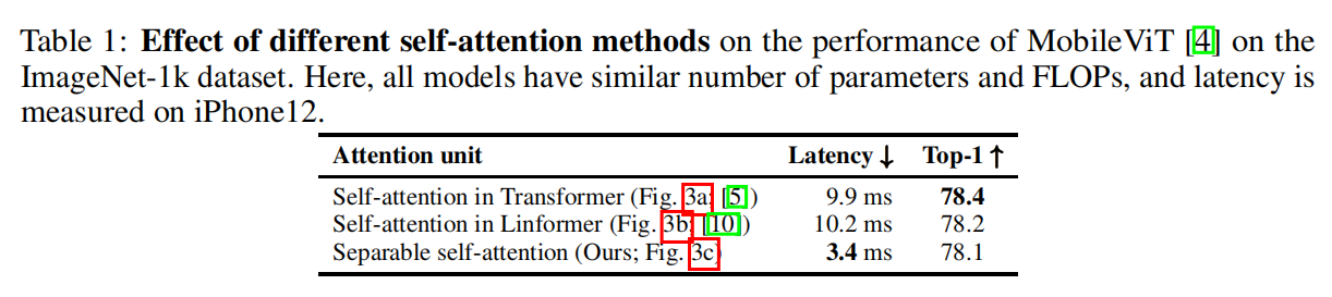 - 提出了一种线性复杂度的可分离自注意力方法,旨在解决移动视觉变换器中的多头自注意力(MHA)效率瓶颈。