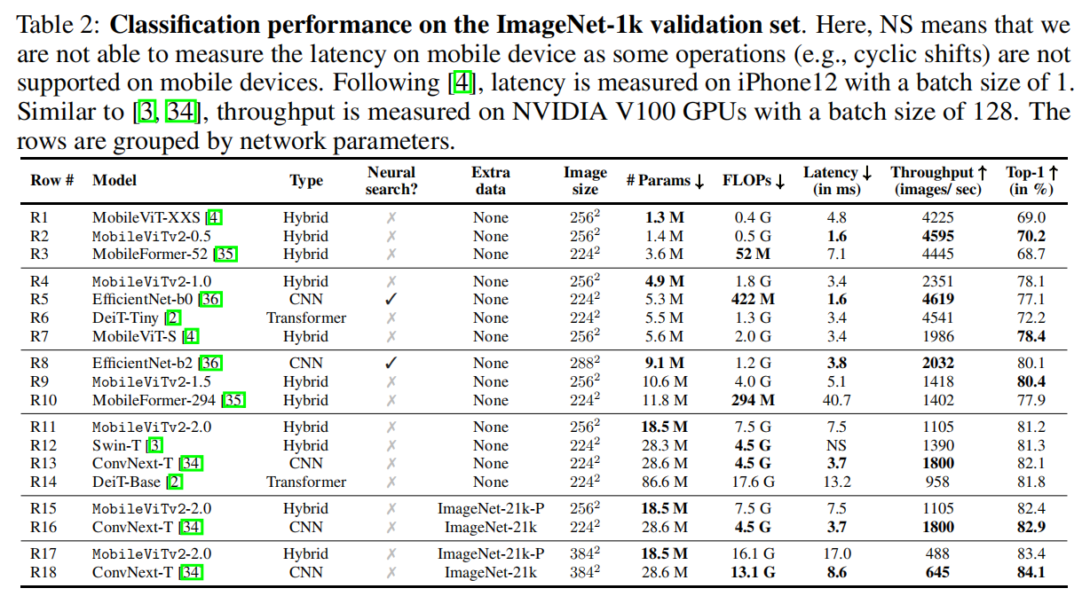 - MobileViTv2 在移动设备上弥合了基于卷积神经网络(CNN) 和视觉注意力Transformer(ViT) 的模型之间的延迟差距,同时通过具有相似或更少参数保持性能。例如,在移动设备上,与基于卷积神经网络的模型相比,ConvNeXt [34] 比 MobileViTv2 (混合模型) 快 2 倍和 3.6 倍,而 DeiT (基于变压器的模型) 相同的性能(参见R11、R13和R14)。过去几年来,针对基于卷积神经网络的模型进行了许多设备级别的优化,这使得基于卷积神经网络的模型在移动设备上的低延迟得以实现(例如,专用硬件用于卷积和使用卷积折叠批量归一化)。由于 ViT 基模型仍然缺乏这些优化,因此生成的推理图并非最优。虽然 MobileViTv2 在 CNN 和 ViT 之间缩小了延迟差距,但我们认为随着类似优化的发展,基于 ViT 的模型的延迟在未来会得到改善。