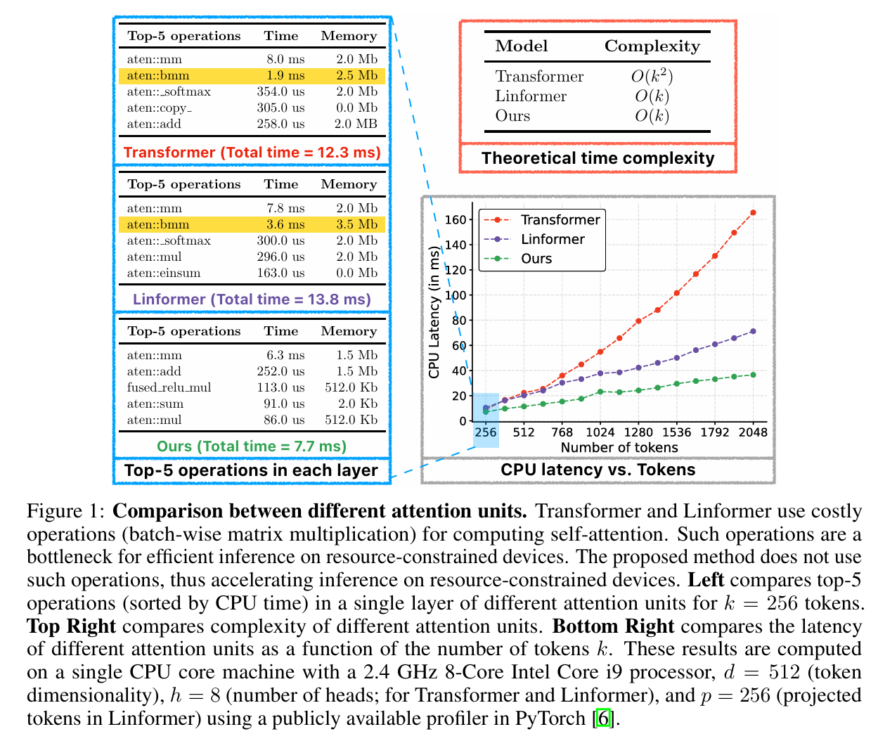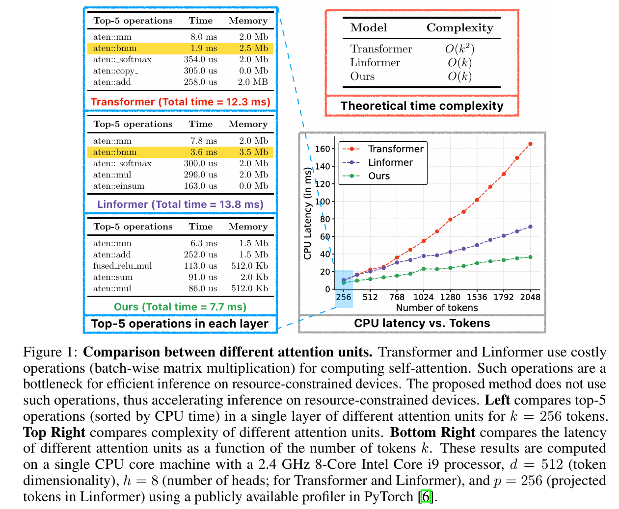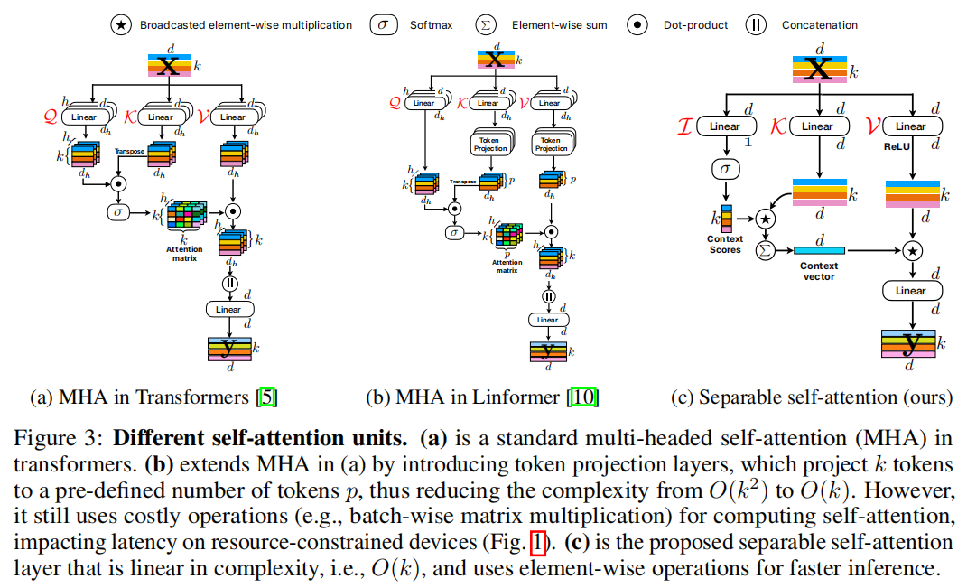MHA 使用缩放点积注意力来捕捉k个标记(或补丁)之间的上下文关系。然而,由于 MHA 具有O(k^2)的时间复杂度,因此它代价高昂。这种二次成本对于具有大量标记k的变压器来说是一个瓶颈(图 1 )。此外,MHA 使用计算和内存密集型操作(例如批量矩阵乘法和 softmax 来计算注意力矩阵;图 1 ),这可能成为资源受限设备上的瓶颈。为了解决 MHA 在资源受限设备上有效推理的局限性,本文引入了具有线性复杂度的可分离自注意(图 3c )。