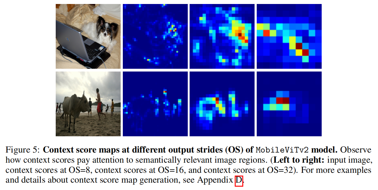 图 5 展示了在 MobileViTv2 网络的不同输出步长下,上下文分数学习的内容。我们发现分离自注意层关注低、中、高阶特征,并允许 MobileViTv2 学习来自语义相关的图像区域的表示。