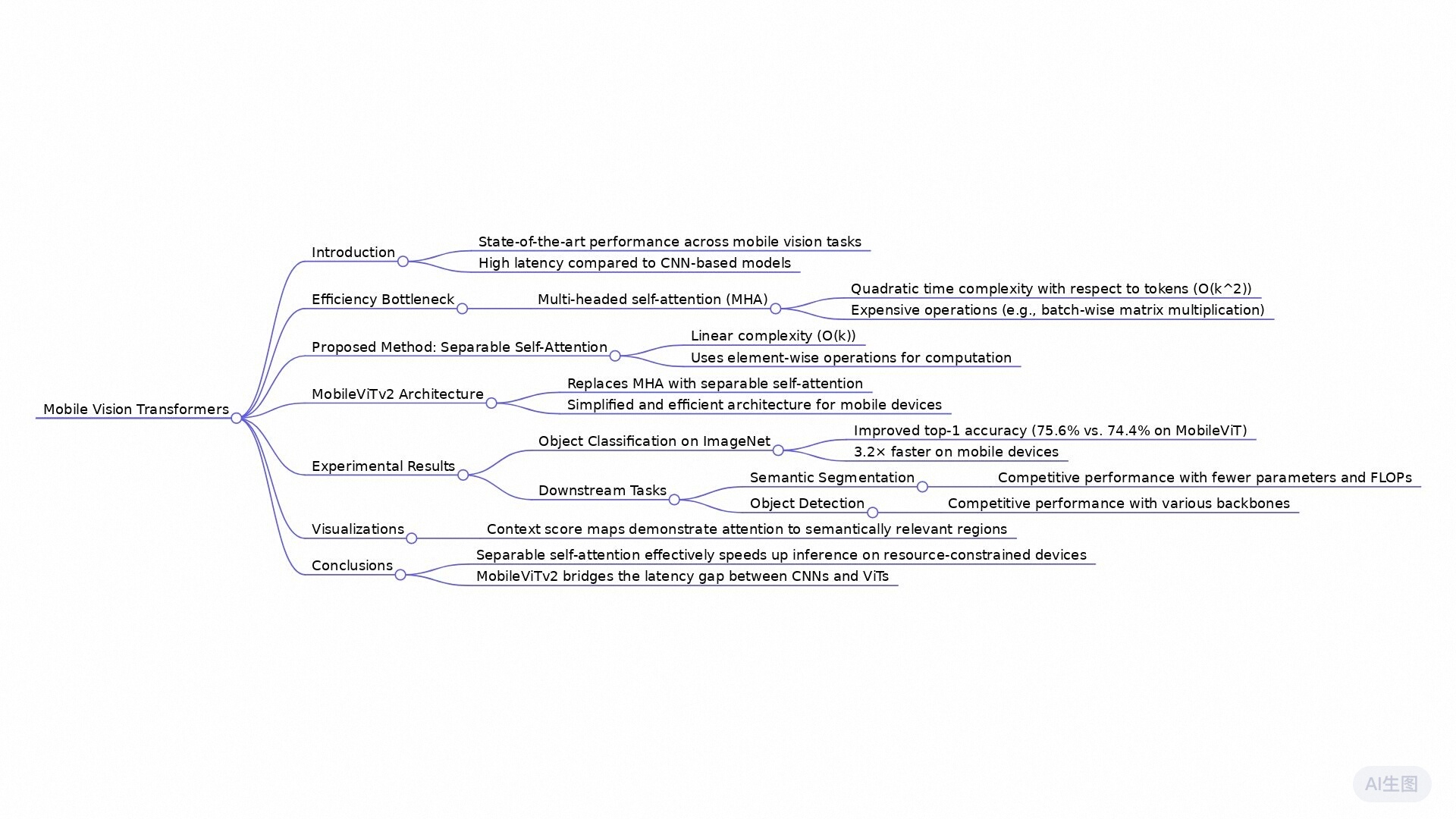 本文提出了一种可分离自注意力机制,以解决移动视觉变换器(MobileViT)中多头自注意力(MHA)造成的效率瓶颈。现有的MHA方法在处理k个标记时的时间复杂度为O(k²),这在资源受限的设备上会导致高延迟。新提出的可分离自注意力方法将复杂度降低到O(k),并通过元素级操作(如加法和乘法)来计算自注意力,从而改善了推理速度。经过实验证明,改进后的模型MobileViTv2在多个移动视觉任务上达到了最先进的性能,包括在ImageNet数据集上取得了75.6%的Top-1准确率,相比MobileViT提高了约1%,且在移动设备上快了3.2倍。该研究展示了可分离自注意力在资源受限设备上的有效性,为未来的视觉模型优化提供了新的方向。