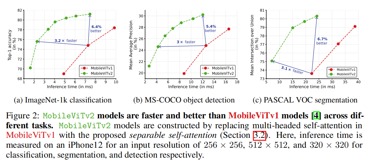 - 当 MobileViTv1 中的多头自注意力层被替换为分离自注意时,产生的模型 MobileViTv2 更快且表现更好(图 2 )。这验证了我们提出的分离自注意方法在移动 ViT 中的有效性。