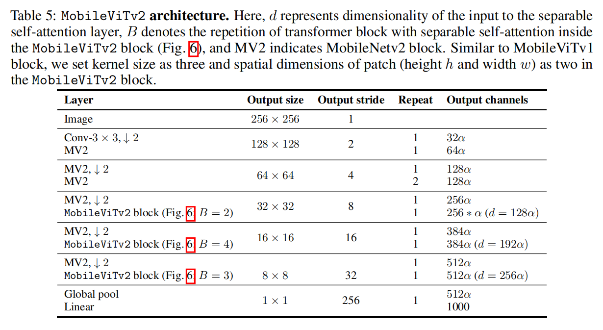 具体来说,我们在MobileViTv1中的变压器块中用提出的可分离自注意力方法替换了MHA。我们称该体系结构为MobileViTv2。由于MobileViT块([4] 中的图1b )的跳过连接和融合块几乎没有提高性能([4] 中的图12 ),因此我们也不使用它们。此外,为了创建不同复杂度的MobileViTv2模型,我们通过宽度乘数α∈\{0.5,2.0\}来均匀缩放MobileViTv2网络的宽度。这与用于移动设备训练三个特定架构(XXS、XS和S)的MobileViTv1形成对比。有关MobileViTv2体系结构的更多详细信息,请参见附录A。