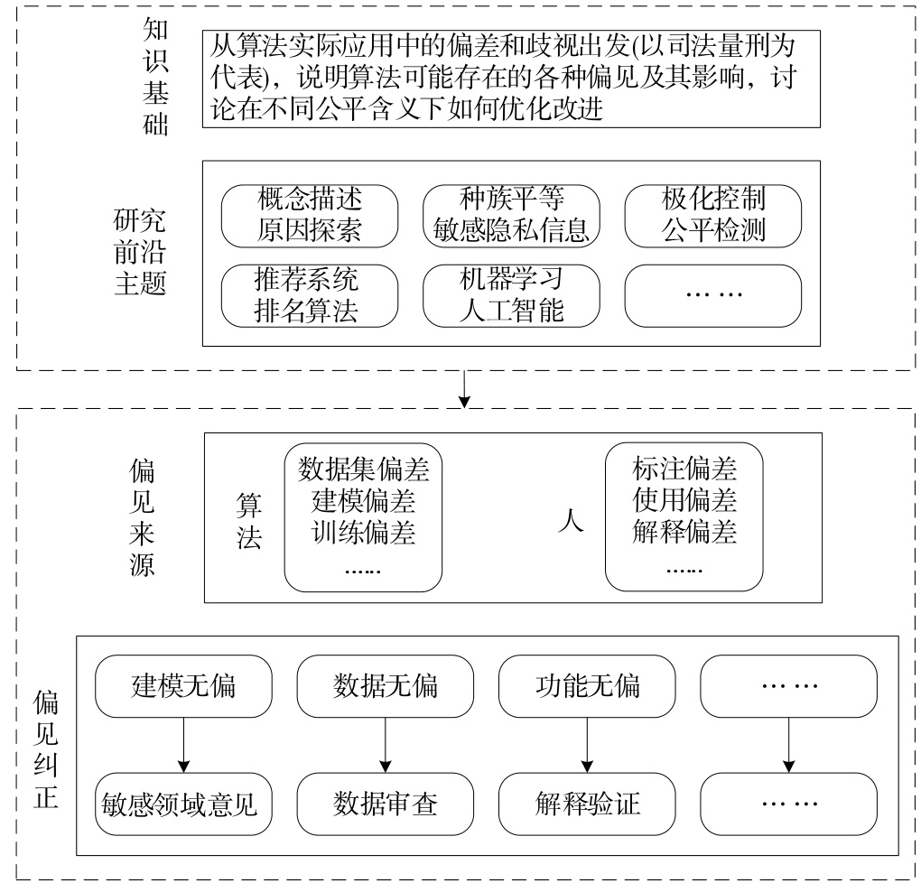 基于文献综述可以看出, 当前国外在算法偏见方面的研究焦点主要涉及对偏见概念的定义及其成因进行了深入探讨, 并围绕性别与种族等敏感隐私信息引发的争议展开了广泛讨论。此外, 研究还着重关注了如何有效遏制极化现象及实施公平监控机制, 同时也对推荐系统的排名机制及其相关算法展开了深入分析, 并在机器学习与人工智能领域中的宏观公平问题上取得了一定成果。