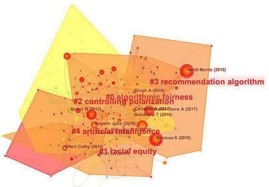 在文献共被引聚类的分析中可以看出,在算法偏见领域所导致的问题主要集中在三个关键领域:涉及种族平等、性别平等以及其他与敏感隐私信息相关的议题。这些议题被认为是最早被提出并广泛讨论的核心问题之一。值得注意的是,在Web2.0时代之后的移动互联网快速发展期间,个性化算法有效缓解了用户的个性化需求问题。然而,在实际应用中是否能够实现对不同个人或群体的公平待遇以及对信息提供者的公平对待,则需要通过进一步的比较研究来探讨其可行性和边界条件。