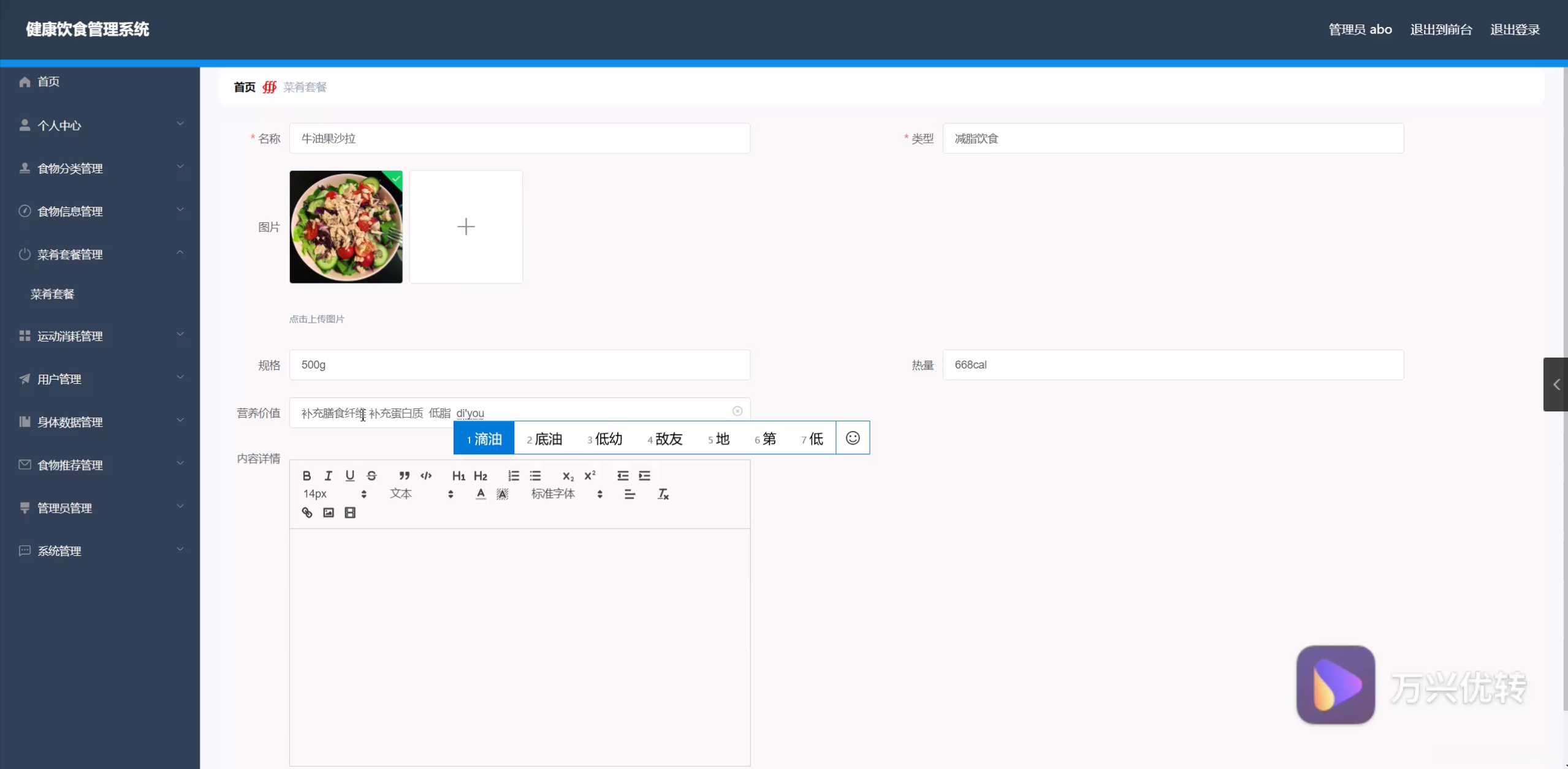 健康饮食管理系统的开发与应用对于提升公众的健康水平具有深远的意义。首先,它能够为用户提供个性化的饮食建议,根据个人的身体状况、生活习惯和健康目标,制定合适的饮食方案。这种个性化的服务能够更好地满足用户的健康需求,帮助他们避免盲目跟风不适合自己的饮食潮流。其次,通过系统的监测和分析功能,用户可以更加清晰地了解自己的饮食结构和营养摄入情况,及时调整饮食习惯,避免潜在的健康风险。此外,健康饮食管理系统还能够提供丰富的健康饮食知识和营养信息,增强用户的健康意识,引导他们形成长期的健康饮食习惯。总之,健康饮食管理系统不仅能够帮助个人实现健康管理,还能够为构建健康社会贡献力量。
