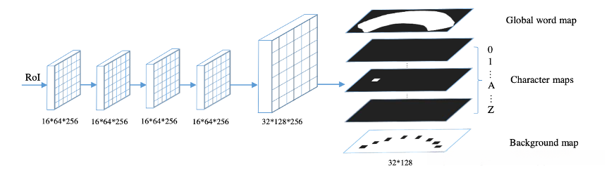 - mask branch:完成文本实例分割和字符分割任务,如下图所示,输入RoI特征图16*64,经过4个卷积核和1个反卷积,输出预测图有38个通道,分别是1个全局文本实例图(任意形状文本的精确位置),10个数字图,26个字母图和1个背景图(用于后处理)。