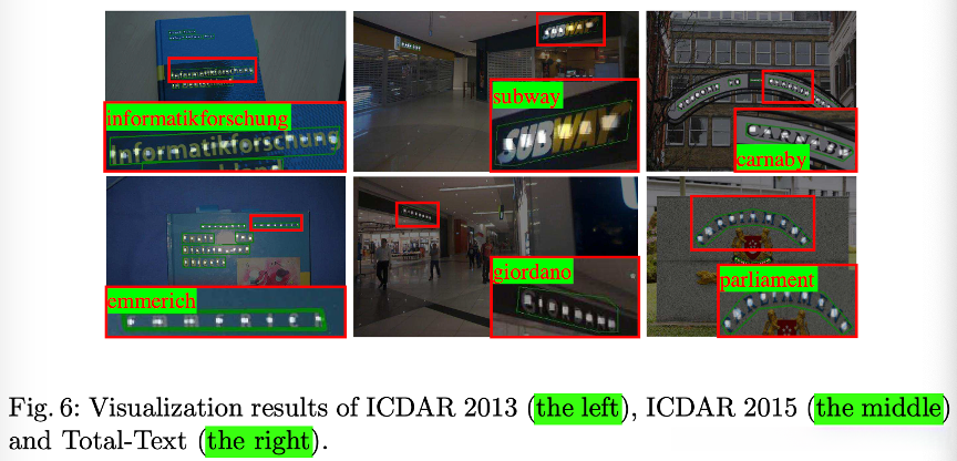图三是本文提出的方法,使用绿色bounding box,是文本检测的结果,红色文本是识别的结果。