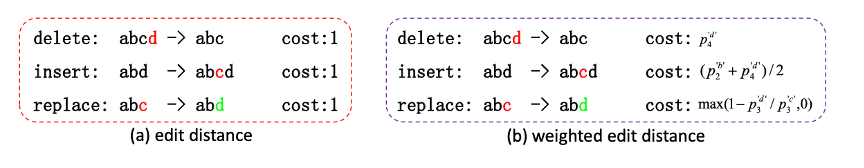 此外,本文还提出了一种新定义的加权编辑距离,用于在给定字典中查找当前预测序列的最佳输出,由于可能存在多个最小距离相同的单词,而无法取决最佳时,考虑到插入、删除和替代的不同代价,对编辑距离进行加权计算求最优,设计初衷是根据当前投票后的字符概率进行三种操作的代价计算。