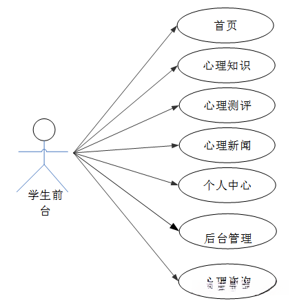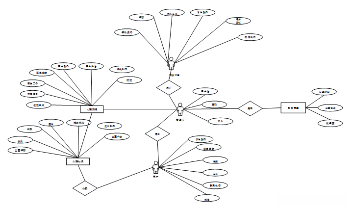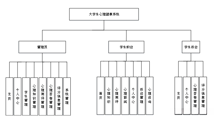 在系统设计阶段形成的系统架构图仅限于此,在这一阶段内所形成的系统架构图也仅仅是该阶段的产物。然而整个系统的架构方案直接决定了后续开发流程的走向基于上述分析可得大学生心理健康系统的整体结构安排如图4-2所示