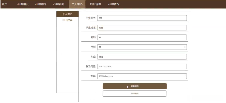 在个人中心页面上浏览其个人信息以及收藏列表,并根据需求对个人学生账号、学生姓名、密码、性别、专业、联系电话以及邮箱等信息进行调整保存(如图5-7所示)。