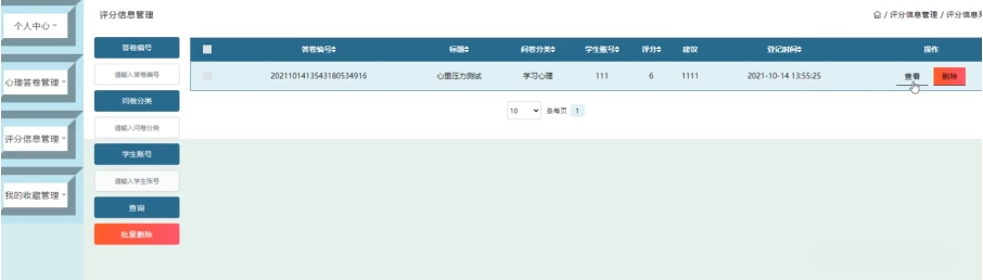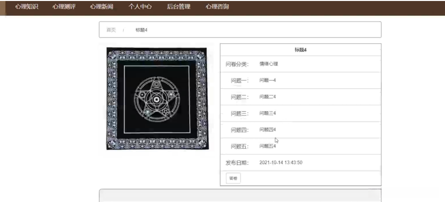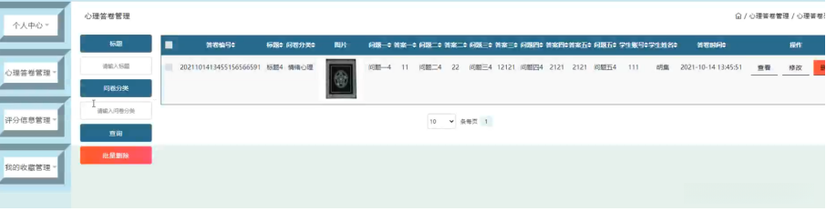 该系统具备完善的管理功能,在心理答卷页面中为学生提供全面的信息展示与操作服务。具体而言,在该页面上学生能够便捷地浏览并了解试卷的标题设置情况以及各类相关分类信息;此外还可以通过图片链接直观观察试卷内容;对于每个问题项(如题一至题五),学生均能进行详细的信息浏览;同时系统内置了完整的操作菜单栏:包含试卷浏览模块(即查看试卷标题)、分类管理界面(用于归类不同类型的试题)、图片上传功能(支持上传补充材料)以及各项基础信息的编辑与删除操作(如图5-10)。