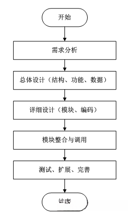 在大学生心理健康系统的开发过程中,在完成需求分析后,则会着手制定整体设计方案。随后将根据设计结果来规划各功能模块的具体实现细节,并选择合适的数据库方案作为支撑。整个系统的开发流程图示如图3-1所示