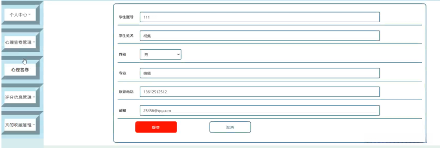 学生登录大学生心理健康系统后端页面浏览个人中心相关内容,并访问个人中心和其他相关功能区域(如心理评估报告管理和评分信息管理模块)。如图5-8所示。