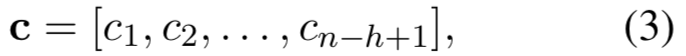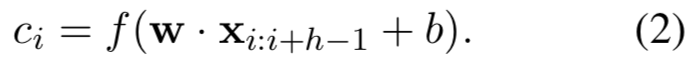 其中⊕是连接运算符。 一般来说,让x_ {i:i + j} 参考单词x_{i},x_{i + 1},...x_{i + j}的连接。 卷积运算涉及滤波器w∈R^ {hk},其被应用于h个词的窗口以产生新的特征。 例如,特征c_i是从单词x_ {i:i + h-1} 的窗口生成的。