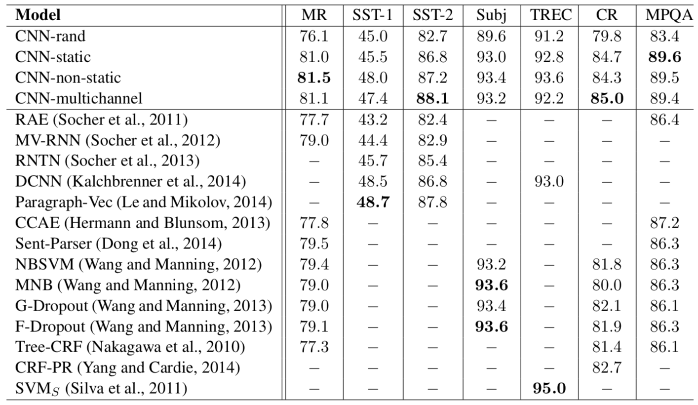 - Kalchbrenner等人 (2014)报告的CNN结果与我们的单通道模型基本相同,结果更差。 例如,具有随机初始化单词的Max-TDNN(时延神经网络)在SST-1数据集上获得37.4%,而我们的模型为45.0%。 我们将这种差异归因于具有更多容量的CNN(多个滤波器宽度和特征映射)。