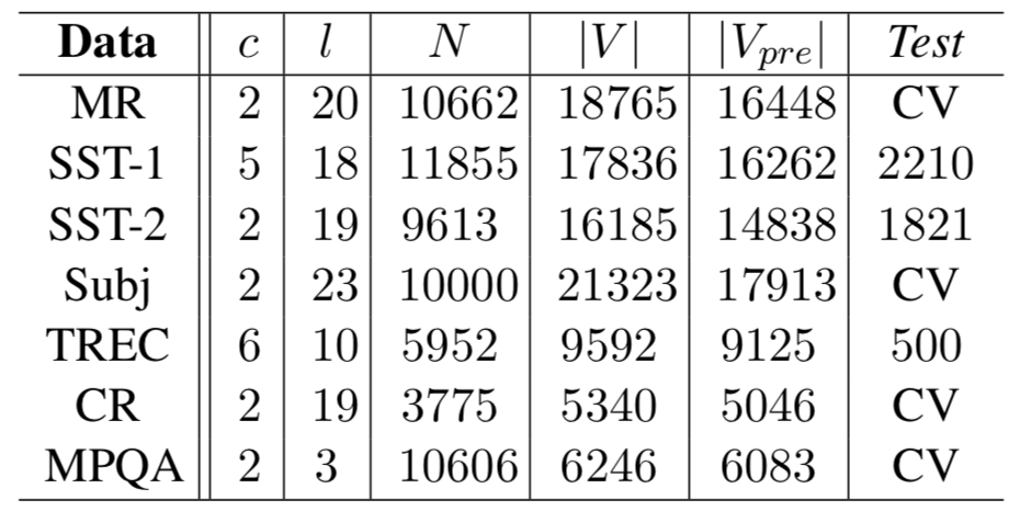 表1:标记后数据集的汇总统计。 c:目标类的数量。 l:平均句子长度。 N:数据集大小。 | V |:词汇大小。 | Vpre |:预先训练的单词向量集中存在的单词数。 Test:测试集大小(CV意味着没有标准训练/测试分割,因此使用10倍CV)。