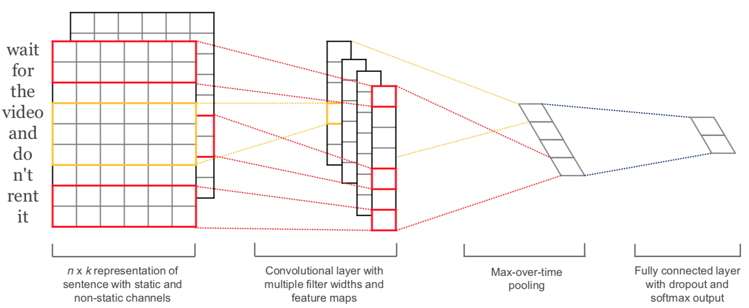 我们已经描述了从一个过滤器中提取一个特征的过程。 该模型使用多个滤镜(具有不同的窗口大小)来获取多个特征。 这些特征形成倒数第二层并传递到完全连接的softmax层,其输出是标签上的概率分布。