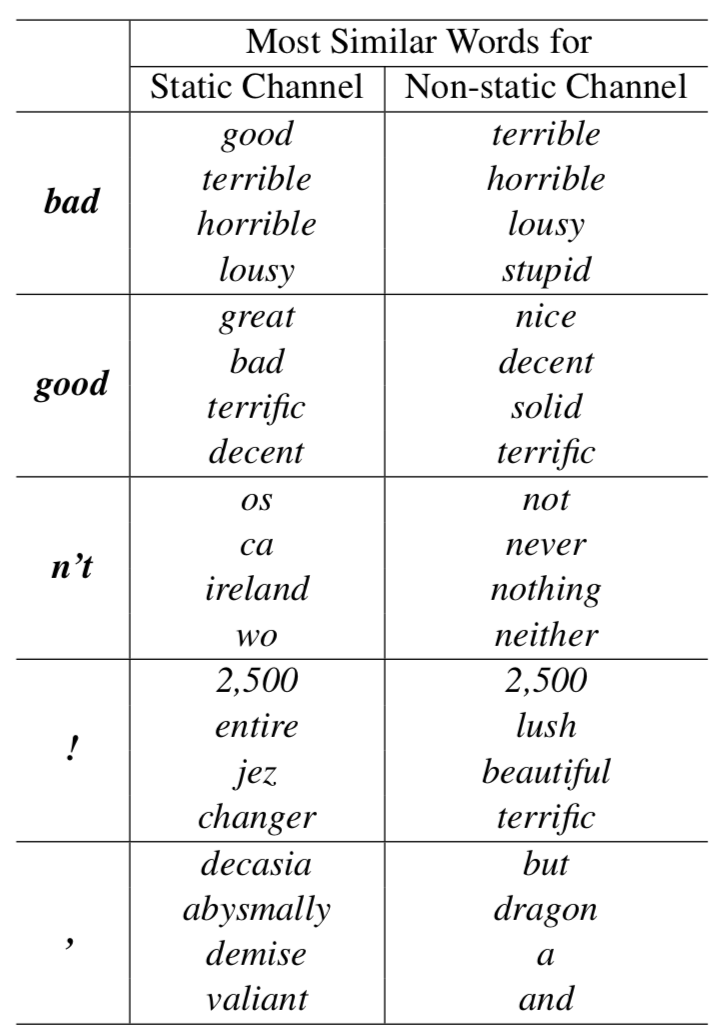 表3:训练后SST-2数据集多通道模型中静态通道中向量(左)和非静态通道(右侧)中的前四个相邻词 - 基于余弦相似度的向量。