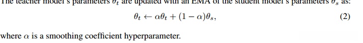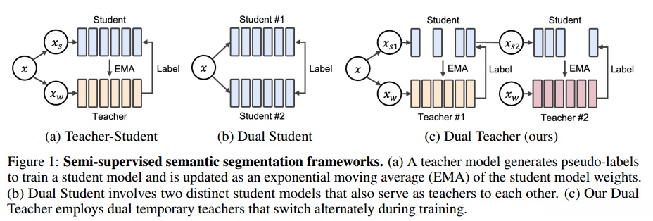 从这个角度来看,我们引入了一个简单而有效的框架——双重教师:一种临时EMA教师模型交替生成伪标签来指导学生模型的方法;同时,学生模型使用自身权重的指数移动平均更新教师模型的权重。我们声称,引入额外的EMA教师通过提供独特和多样化的监督来促进学生的多样化。如图1 (c)所示,双教师由一对师生模型组成,其中两个临时教师模型在训练期间的每个时期都被切换,以教授单个学生模型。